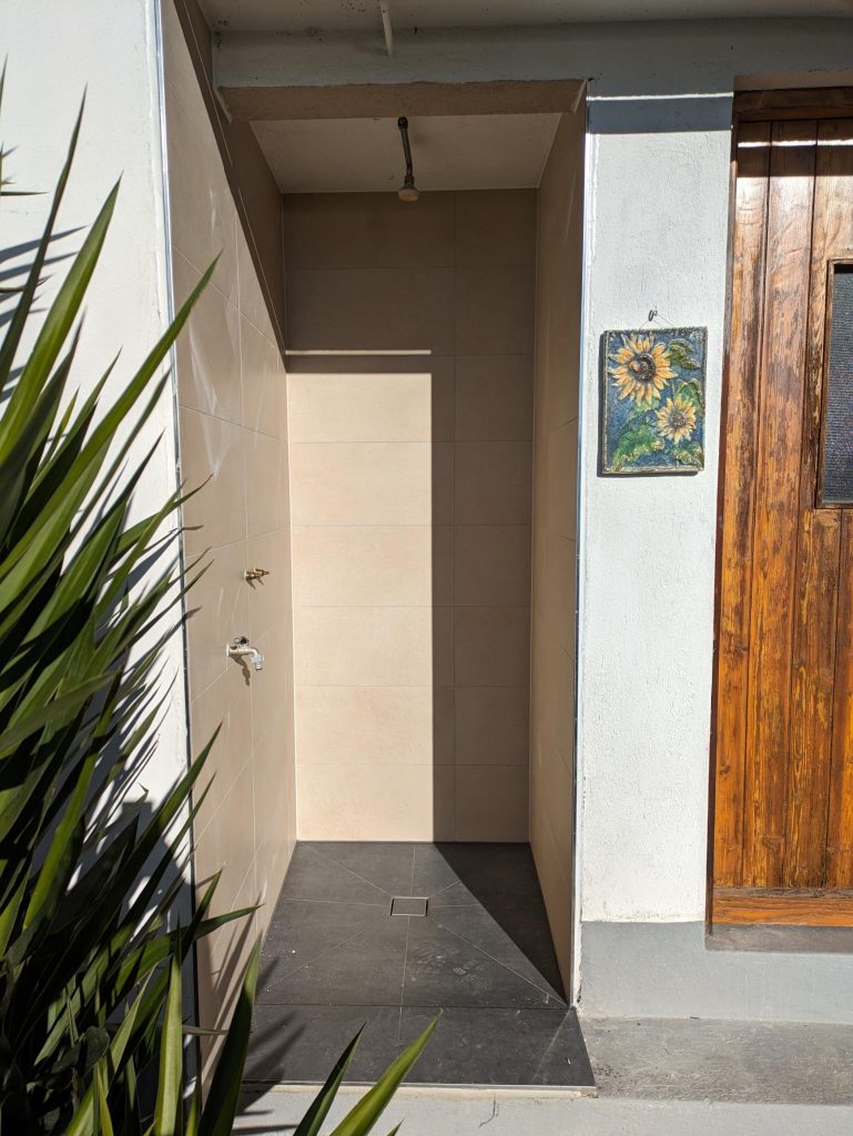 Zu dieser Wohnung gehört eine Terrasse mit direktem Zugang zum Garten. Die am Ende der Terrasse befindliche Außendusche (Neu gemacht 2024) wird im Sommer gerne genutzt. Die Warmwasserbereitung erfolgt durch die Sonne